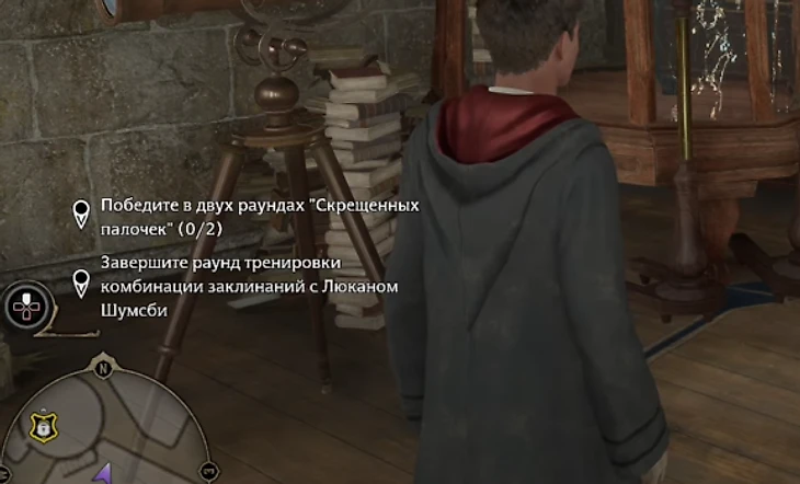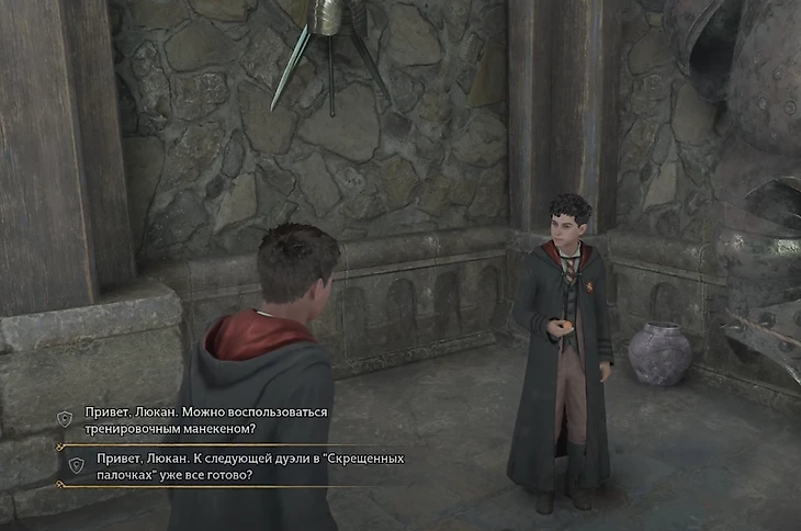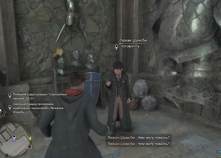 После разговора с профессором вы получите два новых квеста: нужно победить в двух раундах «Скрещенных палочек» и завершить раунд тренировки комбинаций заклинаний с Люканом Шумсби.