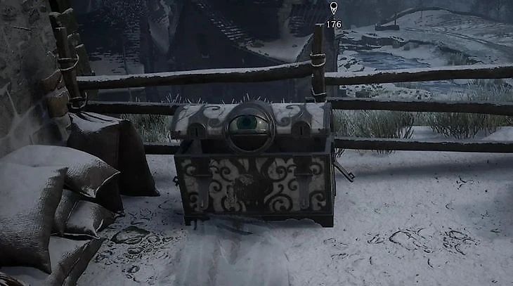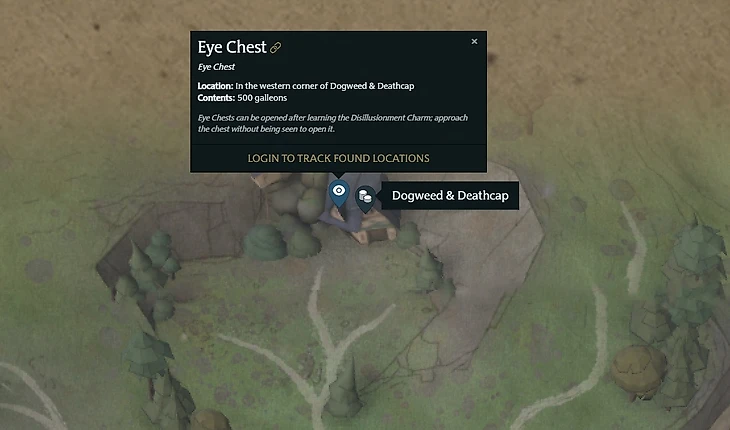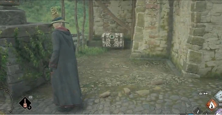 Один сундук с глазом находится слева от места быстрого перемещения на нижнем этаже замка Хогвартс. Поднимитесь по левой лестнице к большой статуе, рядом с которой находится зачарованный ларец.