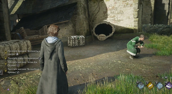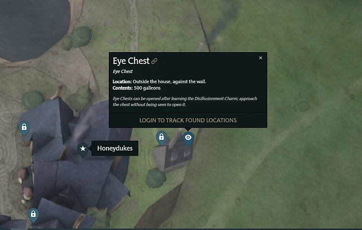 В Хогсмиде протекает речка. Вам потребуется перейти на северный берег и идти в сторону магазина «Волшебная брюква». Рядом с этой лавочкой находится дом, во двор которого следует пройти. Там будет спрятан следующий сундук с глазом.