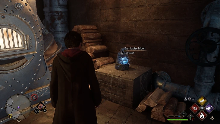 В библиотечной пристройке находится зона с ограниченным доступом. Спустившись по лестнице в этой области, найдите сегментированные бары. Воспользуйтесь заклинанием Ревелио, пока не появится синий контур Камуфлори.