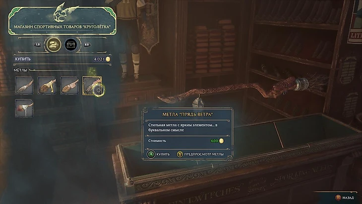 В начале игры магазин метел закрыт, а доступ к нему появится после выполнения квеста «Полеты на метлах». В «Круголетке» продаются метлы на любой вкус. Благо, цены на них одинаковы: все стоят по 600 монет.
