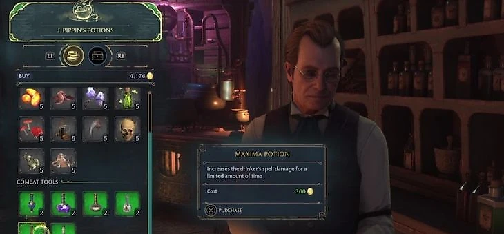 Используйте телепортацию и доберитесь до Западного Хогсмида. Там нужно найти магазин Дж. Пепина. У вас состоится серьезный разговор, и вы узнаете, как приобрести Фокусирующее зелье, зелье Эдурус и зелье Максима. Для этого вам понадобятся деньги в сумме 1100 галеонов. Если денег не достает, вы можете продать ненужное снаряжение и расплатиться с продавцом. С помощью комбинации клавиш купите Фокусирующее зелье.