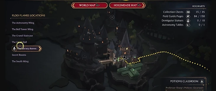 Наверное, самое интересное занятие квеста – это уроки, на которых вы научитесь варить нужное вам зелье. Не пропускайте их, ведь знания – это сила. Чтобы попасть на урок, вам необходимо телепортироваться в класс, где учат. Он находится рядом с библиотекой, а найти его вам поможет красный маркер. Если вы не успеваете, переведите время вперед. Вам откроется карта и вы перейдете к дневному времени с помощью клавиш.