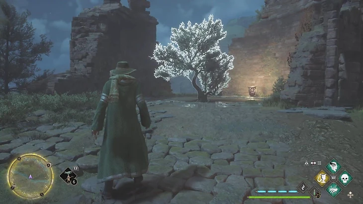 Там будут развалины с подозрительным деревом. Примените на нем заклинание «Левиосо,» и дерево взлетит. К нему прицеплен сундук.