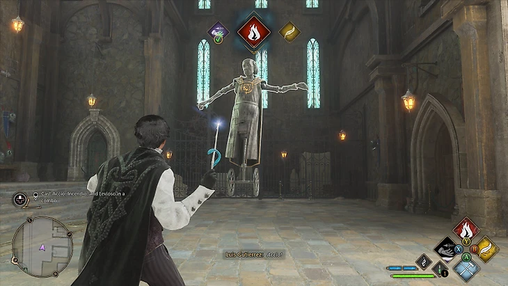 Следующая цепочка начинается с «Левиосо». Этим вы поднимете тренировочный манекен. Проведите 3 базовые атаки. Затем используйте «Акцио» и завершите заклинанием «Инсендио».