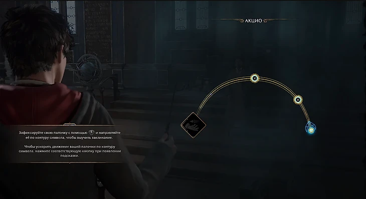 После кат-сцены харизматичный профессор Ронен обучит вас заклинанию «Акцио». Чтобы выучить любое заклинание, нужно пройти простую мини-игру: с помощью мыши/левого стика проведите курсор по контуру символа быстрее, чем его догонит красная искра. Для ускорения движения курсора нажимайте соответствующую кнопку (Пробел/Х/Х – здесь и далее управление на ПК/PlayStation/Xbox), когда курсор проходит по ее указателю.