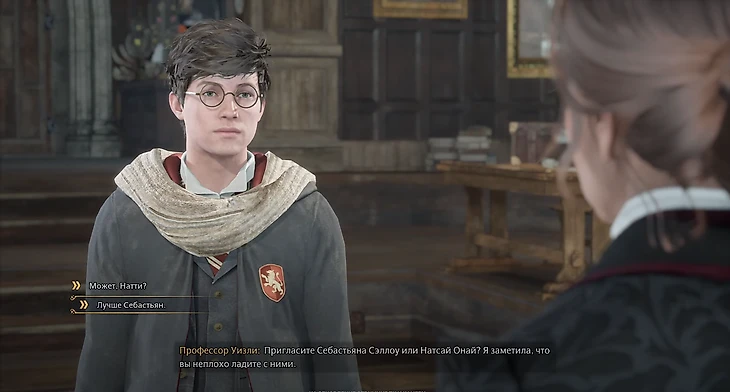 В ходе диалога вам нужно выбрать компаньона для путешествия в Хогсмид. Напарником станет либо Натсай Онай, с которой вы познакомились в ходе квеста «Занятия по заклинаниям», либо Себастьян Сэллоу, с которым вы вступили в магическую дуэль на уроке «Защиты от темных искусств».