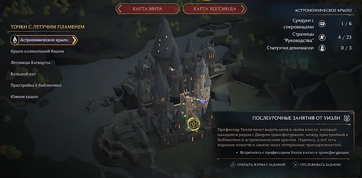 После первого учебного дня в Хогвартсе вместо заслуженного отдыха вы отправитесь на встречу с профессором Уизли. Преподаватель ждет вас в классе трансфигурации, в Астрономическом крыле. Вы можете воспользоваться точкой с летучим пламенем «Класс Трансфигурации», но так как выполнение квеста, скорее всего, будет первым посещением этой области, нажмите «отслеживать задание» на карте и следуйте за тонкой желтой линией от Зачарованного компаса.