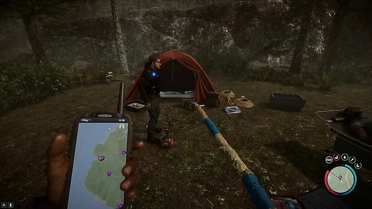 В завязке герой встретит Кельвина. Это оперативник, который после падения вертолета получил контузию и потерял слух. Он поможет с базовыми задачами: повалит деревья, разведет костер, разобьет лагерь, расчистит местность. Запишите поручение в блокноте, и Кельвин сразу за него возьмется.