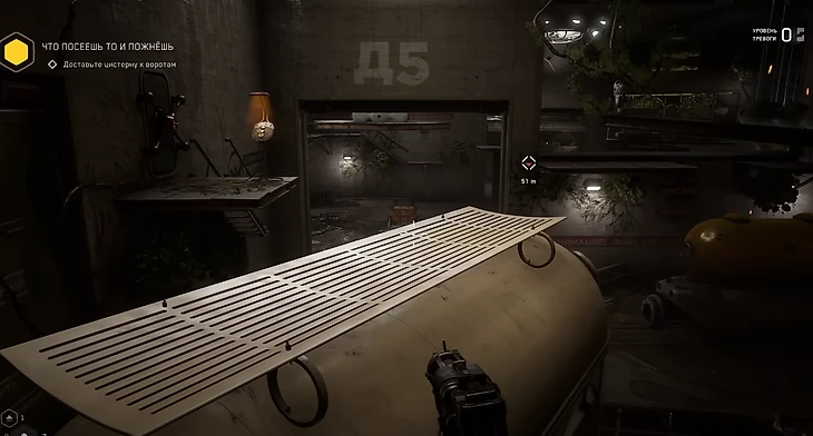 После «Марша цветов» вам нужно еще недолго побродить по коридорам, после чего дойти до чекпойнта, где начнется кат-сцена с ученым в пестицидном цехе. Вы узнаете, что борщевик нужно постоянно опрыскивать, но ПА-400 заканчивается – и вам нужно найти желтый «бидон» с ним.