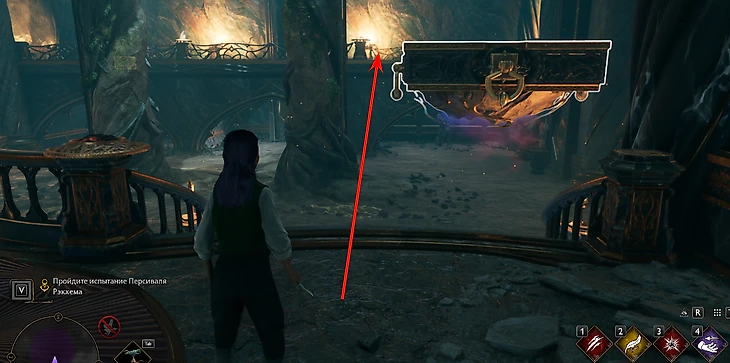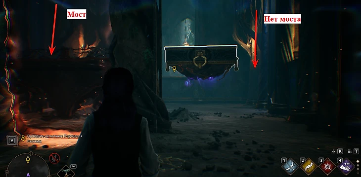 Наверху портал, за которым есть мост, ведущий в следующую комнату (на мосту справа и слева есть сундуки). В комнате нужно активировать точку свечения древней магии, чтобы открыть портал.