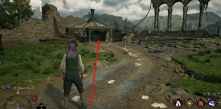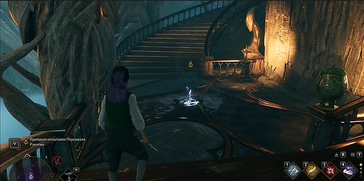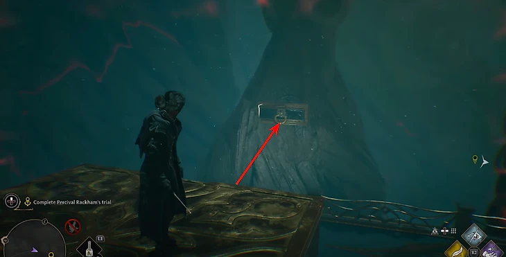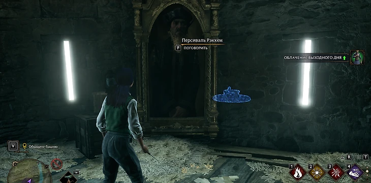 Идите на верх башни, там вам нужно поговорить с портретом профессора Рэкхема; а затем спуститесь на первый этаж и активируйте точку свечения древней магии.