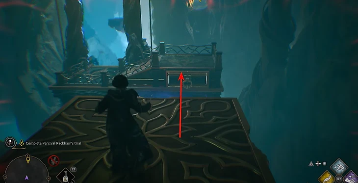 4. Затем выйдите из портала, заберитесь на мост и с помощью «Акцио» доберитесь до выхода из комнаты.