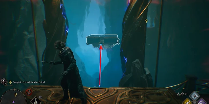 2. Подтяните с помощью «Акцио» платформу к себе так, чтобы вы смогли на нее встать и активировать точку.