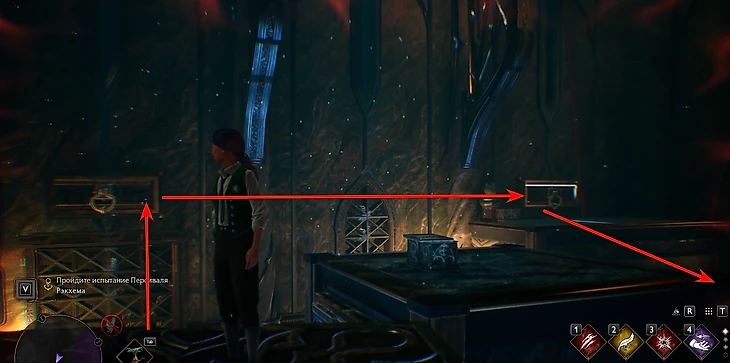 Перед вами появится портал – пройдите в него, чтобы забрать сундук, а затем вернитесь в комнату. Используйте появившиеся крюки, чтобы добраться до еще двух сундуков и выйти из комнаты. Последовательность действий мы изобразили на рисунке.