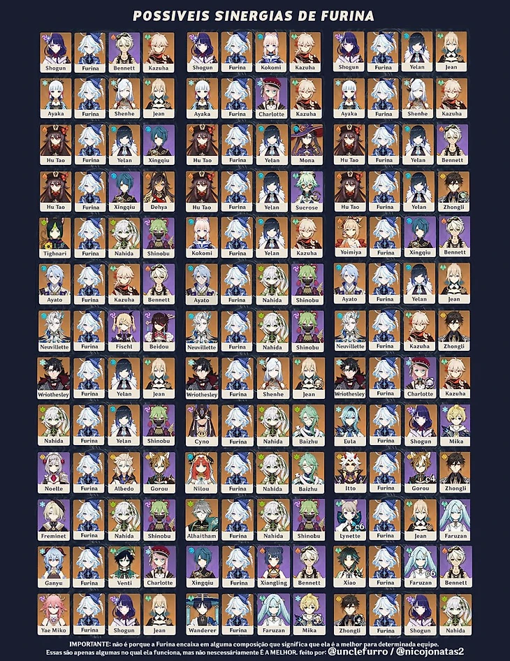 Фурина подойдет в почти любую команду. Она может стать саппортом и саб-дпс в команде на бутонах, поскольку может хилить членов отряда. Также ей будет хорошо в командах, где герои используют оружие из Фонтейна с Долгом жизни, чтобы быстро отхиливать их. Идеальный вариант – играть ее со вторым Гидро героем, у которого способности зависят от макс. здоровья, чтобы получить бонус от резонанса и от обоих героев. К таким относятся Невиллет, Е Лань, Кандакия, Нилу, Кокоми и Барбара. Для Аято, Тартальи, Моны и Син Цю здоровье будет лишь приятным дополнением.