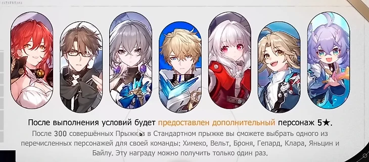 После совершения 300 прыжков стандартного баннера вам дадут на выбор одного из пятизвездочных персонажей этого баннера – Яньцин, Гепарда, Броню, Вельта, Химеко, Клару или Байлу. Эта награда работает всего один раз.