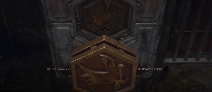 Подойдите к большим воротам и поверните эмблему так, чтобы клюв птицы смотрел направо, а затем встать ее в свободный слот. Ворота откроются, и вы сможете пройти дальше.