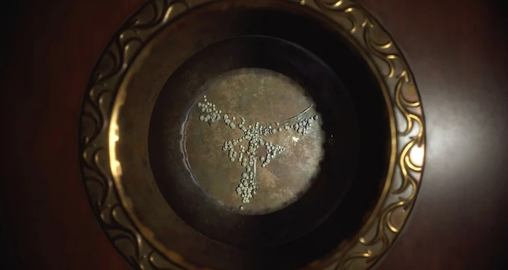 Поднимитесь наверх и вставьте мраморный шар в запертую дверь. Вращайте его так, чтобы пузыри составили рисунок насекомого (как на картинке выше). Внутри комнаты обыщите стол в противоположном углу. Достаньте ключ, после чего начнется кат-сцена, завершающая главу.