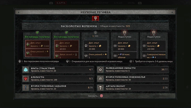 Чтобы добыть еще одну флягу, повышайте известность. Для этого проходите подземелья, зачищайте крепости, открывайте врата перемещения, исследуйте новые области, активируйте алтари Лилит и выполняйте побочные квесты. Когда накопите 500 очков известности, получите 10 тысяч золота и дополнительное зелье лечения.