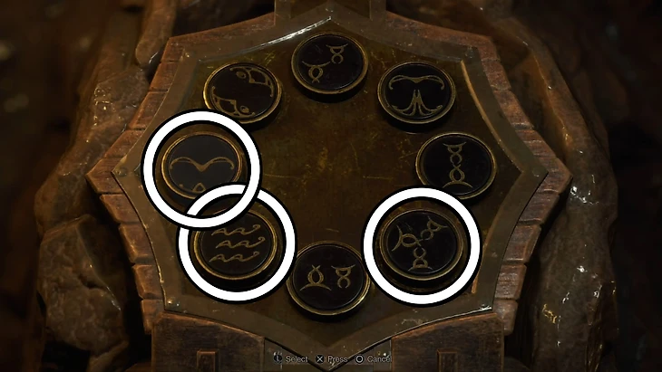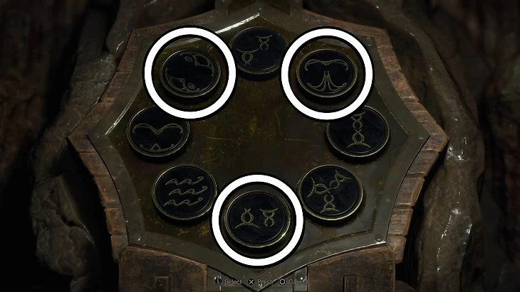 Найдя все символы, подойдите к пьедесталу, где будут вводится на дисках символы для решения загадки. Следующие символы нужно будет выбрать на дисках: