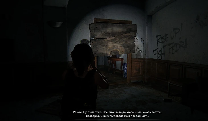 Нужно следовать за Райли наверх и пролезть под прибитой досками дверью в комнату. В этой комнате на деревянном письменном столе будет лежать плакат и вы сможете его забрать себе.