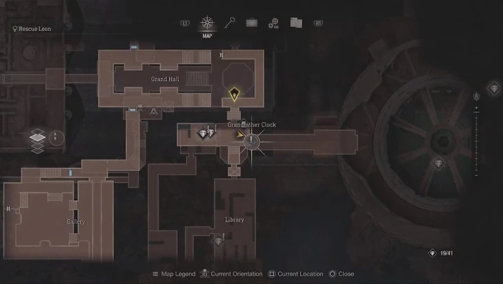 Установив правильное время на дедушкиных часах, вы получите «Знак отличия семьи Салазар». После этого вам в любом случае предстоит бежать через библиотеку, воспользовавшись секретной стеной, расположенной справа от лифта. Так вам не придется прибегать к помощи лифта для того, чтобы попасть в комнату.