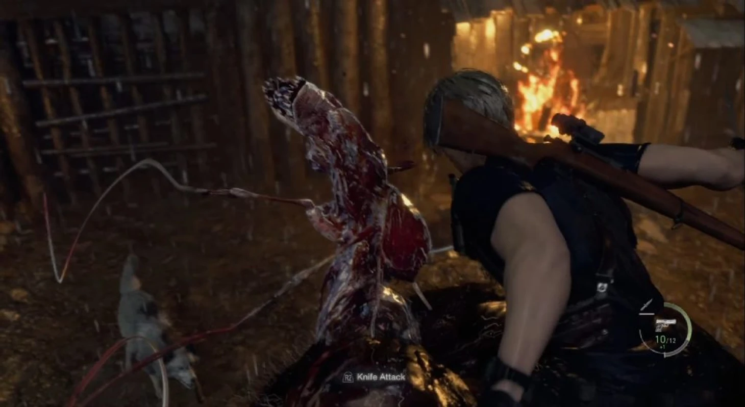 Спустя время к вам на помощь прибежит собака. Когда начнется кат-сцена, в которой она кусает монстра за ногу, держитесь поближе к нему, так как он вскоре упадет на землю, оставив вам возможность нанести урон паразиту.