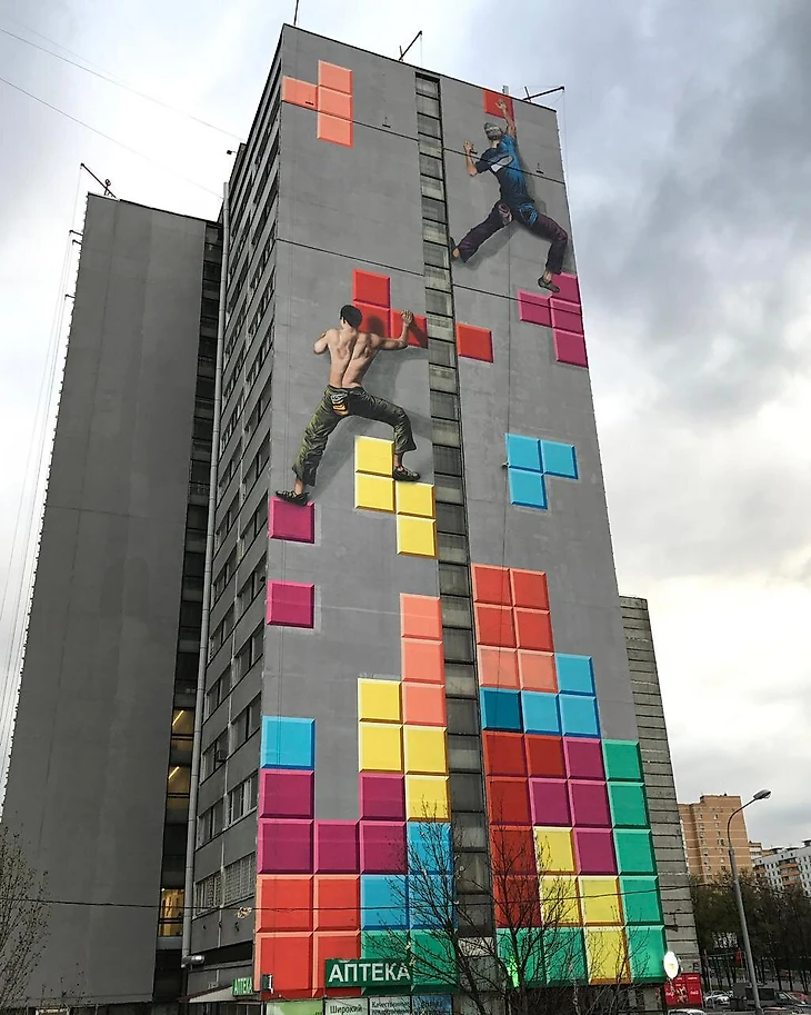 35. В Москве на ул. Профсоюзная, д. 69 есть граффити «Тетрис», созданное художником Дмитрием Левочкиным (известным как Mouk). Автор считает, что игра Пажитнова похожа на жизнь: «Тетрис» – это как раз игра с препятствиями, которые нам нужно преодолевать на пути к своей цели».