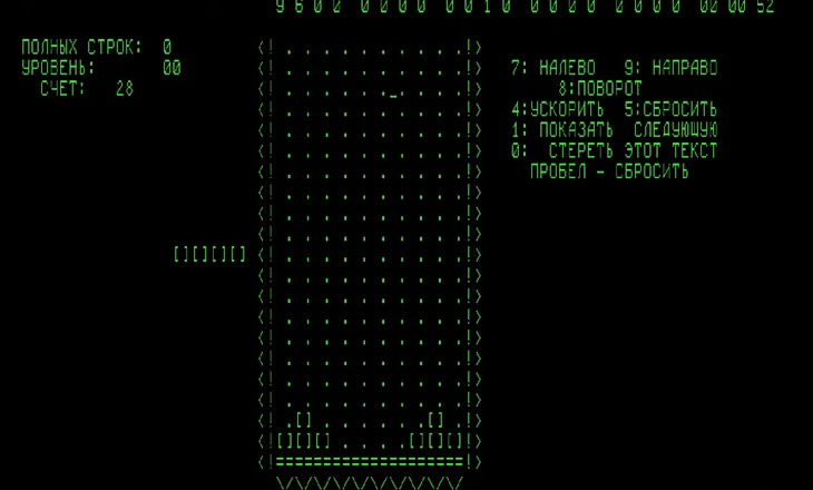 6. Первая версия «Тетриса» была текстовой игрой. У «Электроника-60» не было графического интерфейса, поэтому все приходилось создавать из текстовых символов. Например, каждый блок представлял собой пробел, заключенный в квадратные скобки.