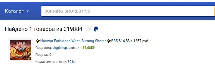 В настоящий момент релиз DLC не пользуется большой популярностью у посредников. Например, на plati.market есть только один продавец, предлагающий купить Burning Shores для Horizon Forbidden West за ~1257 руб.