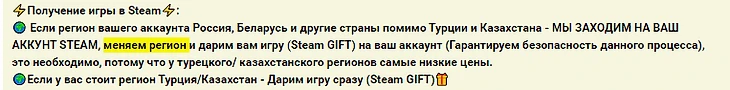 Обратите внимание, что часть продавцов на Plati.market рекламирует продажу гифта («ключа») для всех регионов, но по факту для получения гифта продавец поменяет регион вашего аккаунта.