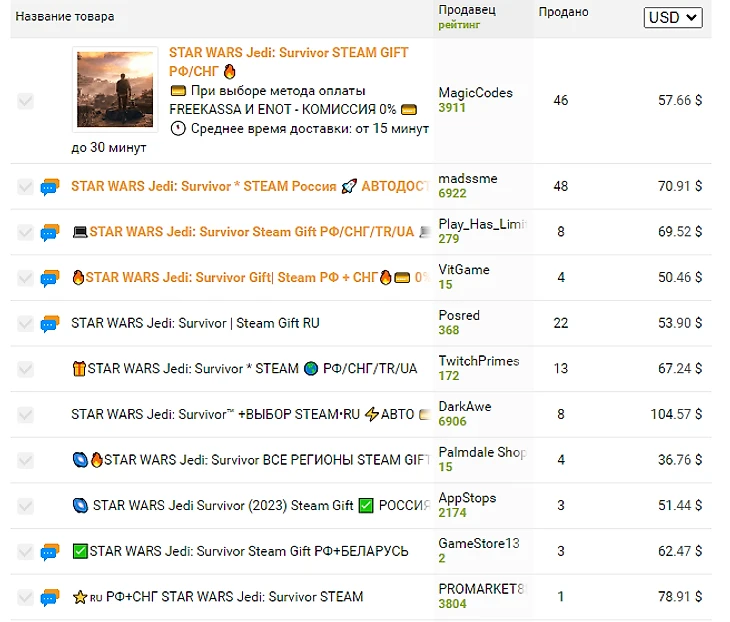 С российским аккаунтом купить игру не получится, поэтому нужно менять регион или регистрировать новый. Но самый простой способ – купить гифт Star Wars Jedi Survivor на маркетплейсах посредников.