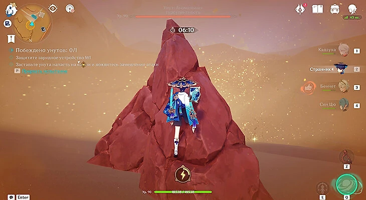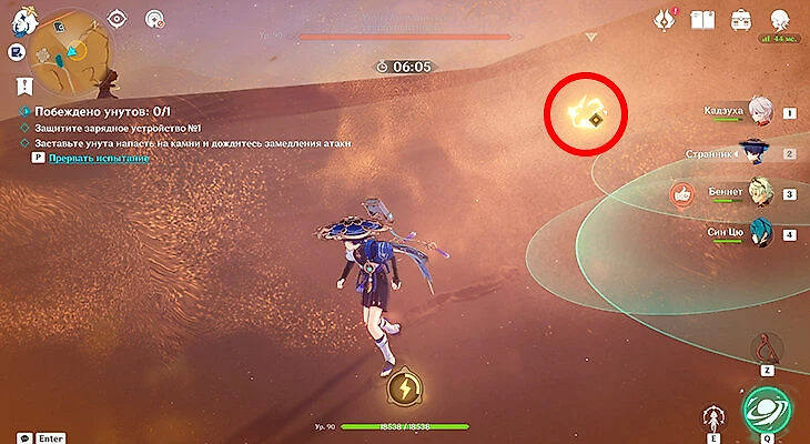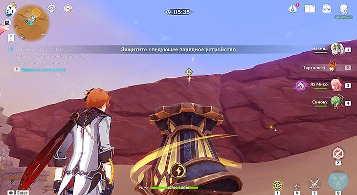 Защитите первое устройство, убив 7 монстров. Когда унут будет вылезать из-под земли, на некоторое время появится круг, указывающий, где он вылезет. Поэтому отойдите, чтобы вас не сбило с ног. Врагами будут две первозданных конструкции, а также хиличурлы, митачурл с каменным щитом и Гео шамачурл. Можете взять двуручника, чтобы было проще снимать их щиты.