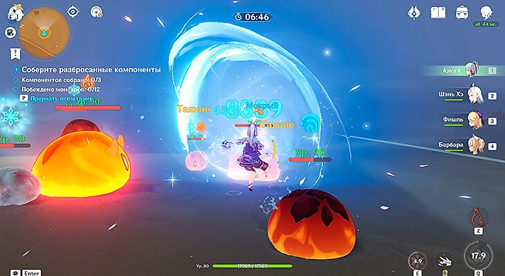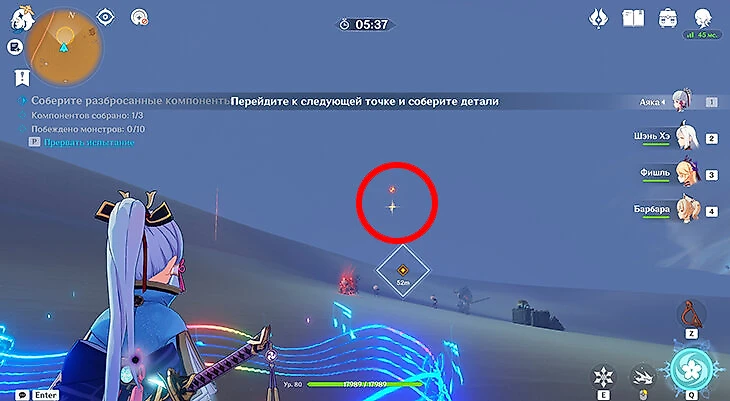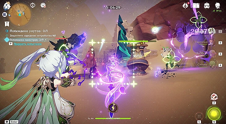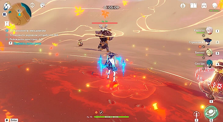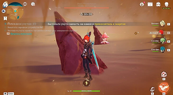 На заключительном этапе понадобится уничтожить целых трех унутов. Бонус – урон от взрыва стихий всего отряда увеличивается на 20%. Первое зарядное устройство охраняют Пиро слаймы и хиличурлы, разберитесь с ними, вам будет мешать унут – на земле постоянно будут появляться бирюзовые круги, указывающие на его атаки. Старайтесь проходить так, чтобы у всех зарядных устройств было больше 50% прочности – за это дают отдельную награду.