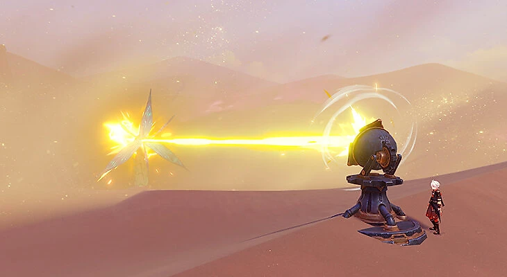 Соберите энергию из камней и вернитесь к пушке, чтобы выстрелить. Третье зарядное устройство охраняют Гео шамачурлы, которым можно разбить постамент двуручным мечом или сбить катализатором или луком, а также обычные хиличурлы и митачурлы. После этого будет третий выстрел из пушки, и третий унут перестанет беспокоить жителей пустыни.