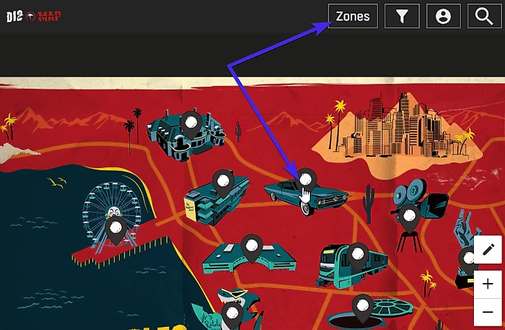 Перейти к нужному району на интерактивной карте можно через кнопку Zones или мини-карту в центре интерактивной карты.