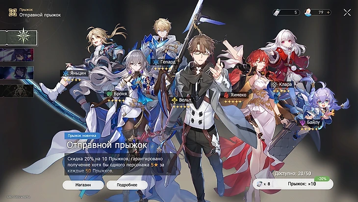 Гача-система, в которой за прыжки (крутки) получаешь персонажей, полностью переехала из «Геншина», за исключением стандартного баннера, но об этом чуть позже.