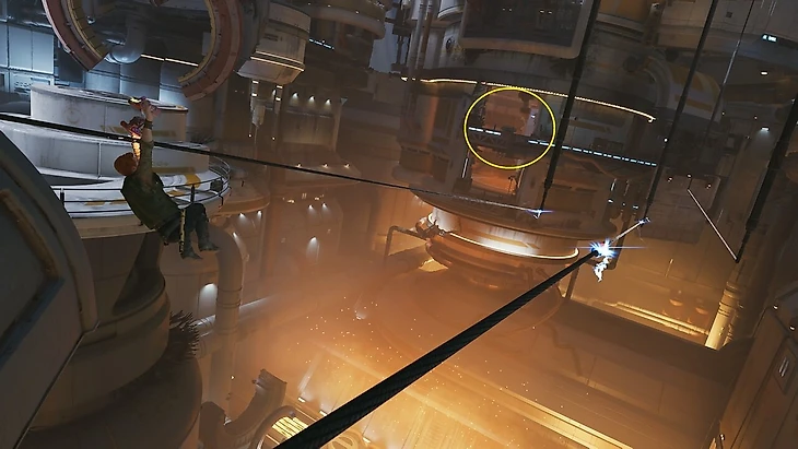 Поднимитесь по тросу у круга медитаций Observatory Understructure, опустите элетродротиком стену для бега и запрыгните на платформу. Еще один выстрел по щитку поднимет стену и откроет паркур-головоломку со стимом в конце. Для прохождения понадобятся навык Dash и улучшенный крюк.