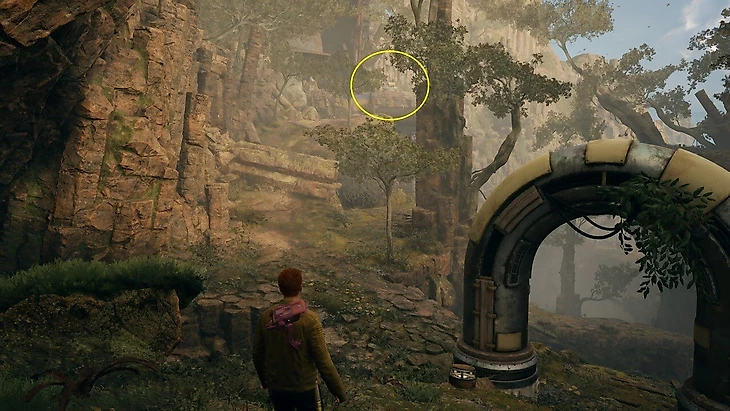 Бегите по тропе у круга медитаций Mountain Ascen, перелетите обрыв на летающем звере и найдете запертую дверь. Ее снесет взрыв дроида-камикадзе, который бродит неподалеку.
