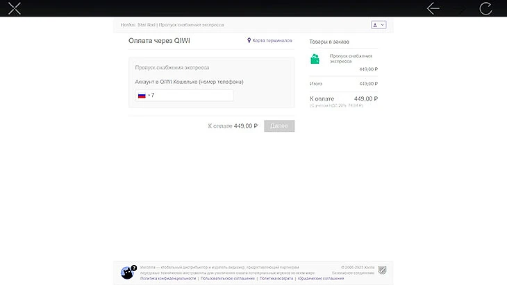 В Epic Games Store тоже можно оплачивать через Qiwi, как в «Геншине». Скачайте лаунчер EGS с помощью кнопки в правом верхнем углу сайта. После установки лаунчера войдите или зарегистрируйтесь в EGS, найдите в разделе бесплатных игр Honkai Star Rail, запустите через EGS и выберите в магазине оплату через Qiwi.