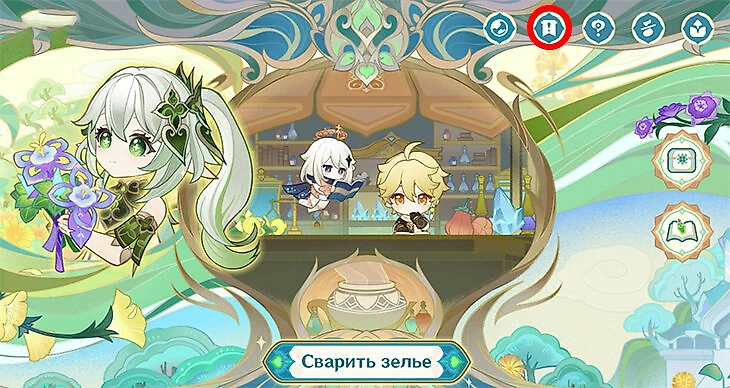 Далее выберите компаньона (кликните на Нахиду или Сайно сбоку экрана) и побеседуйте с ними. После этого можно переходить в меню зельеварения. Добавьте полученные ингредиенты в котел и кликните на воду или масло справа. Перемешайте и подогрейте, чтобы получилось зелье.