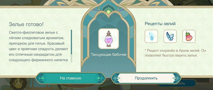 Потом зайдите в меню рецептов (кнопка под наградами в главном меню) и соберите по 1000 моры за каждый новый рецепт. За открытие 16 рецептов дадут 5 священных масел для прокачки артефактов.