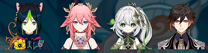 Команда 2: Тигнари, Яэ Мико, Нахида, Чжун Ли. В этой команде Тигнари играет через заряженные атаки под щитом, пока Нахида и Мико вносят урон вне поля.