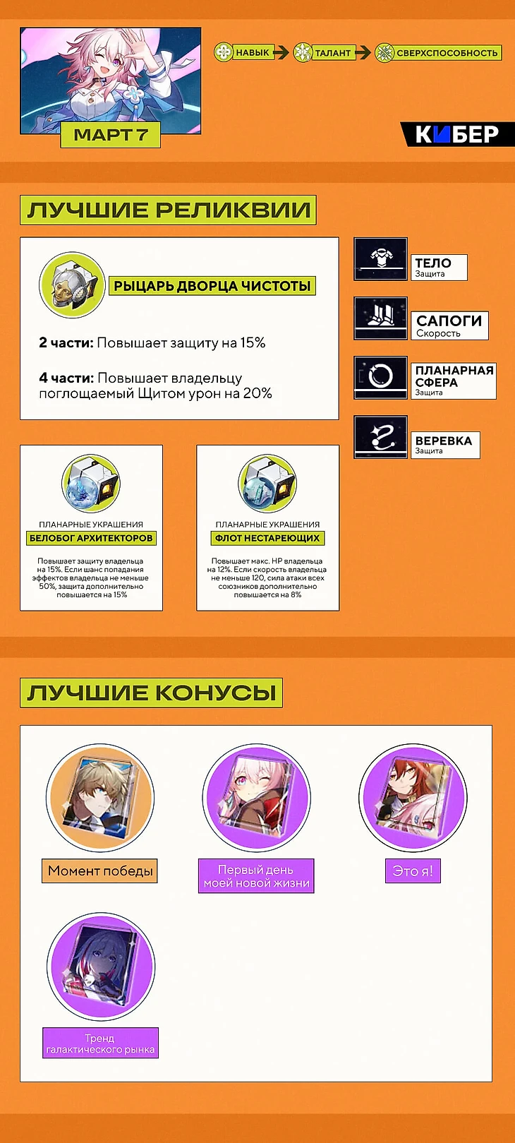 Март тоже дают бесплатно в самом начале игры – буквально после первой миссии. С реликвиями на нее уже сложнее, потому что они фармятся в Сяньчжоу: Лофу или даются за высокие уровни освоения. Как и с планарными украшениями, в идеале нужен сет «Белобог архитекторов» из шестого мира Вселенной, но его можно заменить «Флотом нестареющих» из третьего мира или «Живым Вонваком» из четвертого.