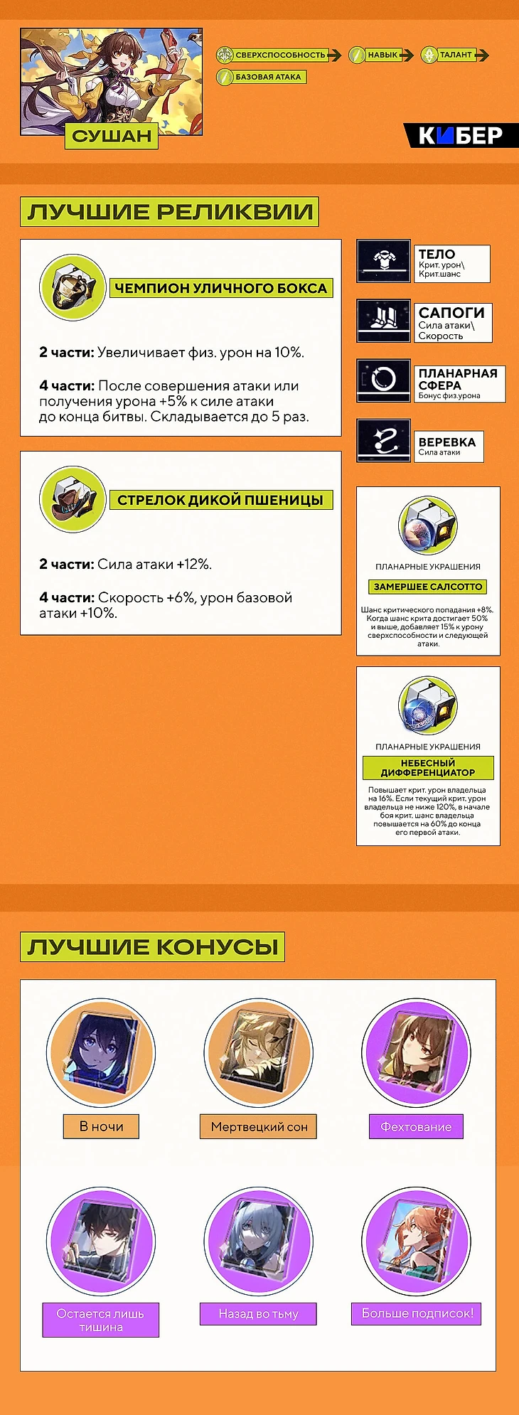 Она лучше Дань Хэна, потому что у многих мобов и мини-боссов уязвимость к физическому урону. Вы будете часто встречать рейнджеров пустоты, мнимых ткачей, теней вечнозимья, теней хранительницы, солдат Среброгривых стражей и, самое важное, свинок-копилок с этой уязвимостью. В Виртуальной вселенной Сушан будет полезна против Кафки, Гепарда, саммона Коколии Брони, а еще уязвимость к физическому урону есть у еженедельного босса Зверя судного дня. Если нет пятизвездочных персонажей Охоты, то между ней и Дань Хэном лучше выбрать Сушан.