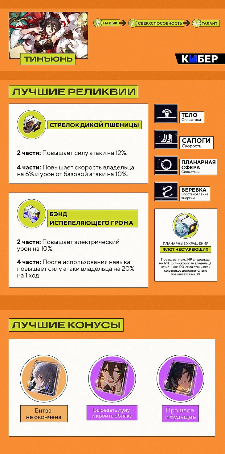 Она хороша в связке с Зеле и Цзин Юанем, разница только в используемом оружии: конус «Свидание со звездами» дает бонусный урон, если элементы баффера и дамагера совпадают. Цзин Юань – герой с электрической стихией, как и лиса-жена, поэтому она будет эффективнее использовать «Свидание со звездами».