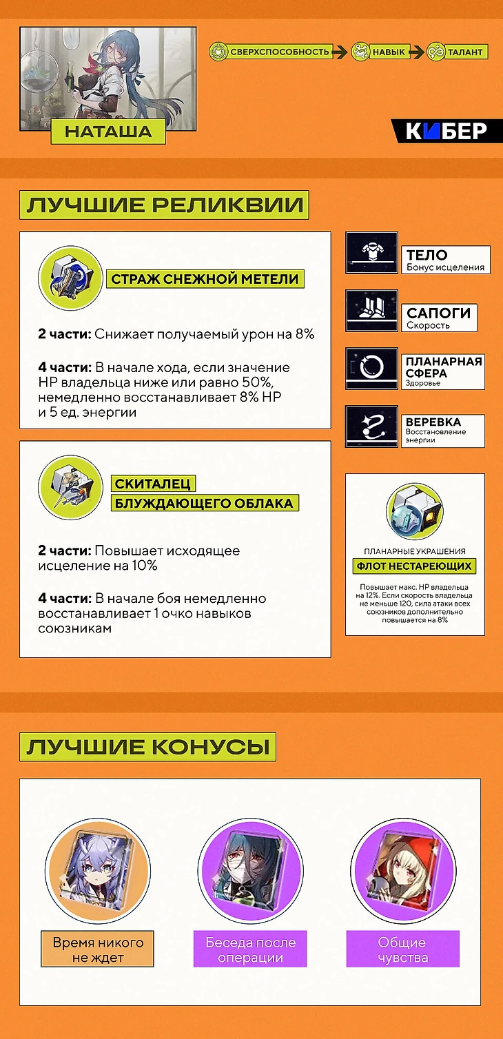 Без хилера в играх с командами никуда. Поскольку на момент патча 1.0 в игре всего два хилера и получить Байлу можно только благодаря рандому, Наташа – идеальный вариант. Наташу дают всем бесплатно и ее легко прокачивать: пещера коррозии с реликвиями «Скиталец блуждающего облака» находится в первых локациях после космической станции, а в характеристиках можно на первое время не выбивать что-то особое, а подобрать везде здоровье. Дальше лучше следовать оптимальному билду с сапогами на скорость, чтобы не дожидаться, пока ваших керри убьют. Планарная сфера и веревка тоже добываются относительно легко – набор «Флот нестареющих» выпадает в третьем мире Виртуальной вселенной.
