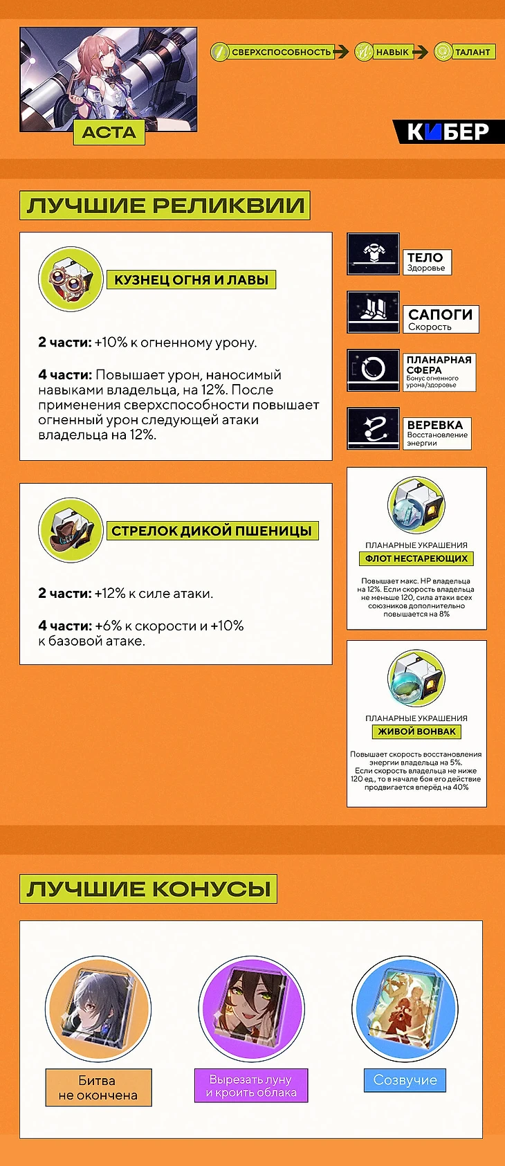 Аста – замена Тинъюнь и Брони в командах, где дамагерами выступают Химеко или Хук. Ее пассивка таланта дает 18% бонусного огненного урона, а с конусом «Свидание со звездами» она может стать еще полезнее.