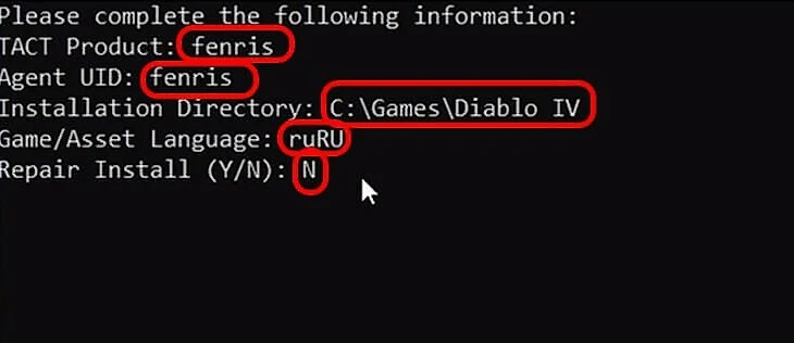 TACT Product: fenris Agent UID: fenris Installation Directory: C:\Games\Diablo 4 (путь можно менять, главное – 85 Гб свободного места) Game/Asset Language: ruRU (если нужны английские субтитры и озвучка, вводите enUS) Repair Install (Y/N): N